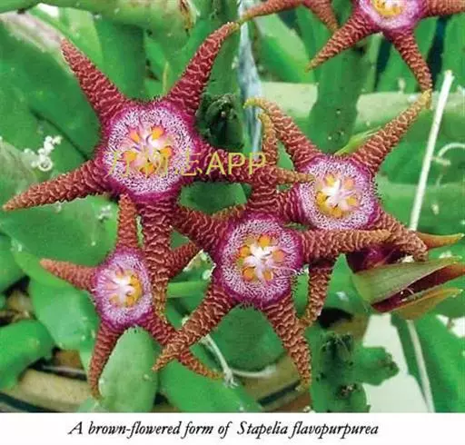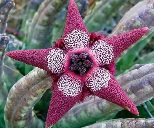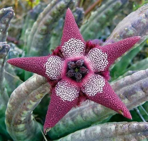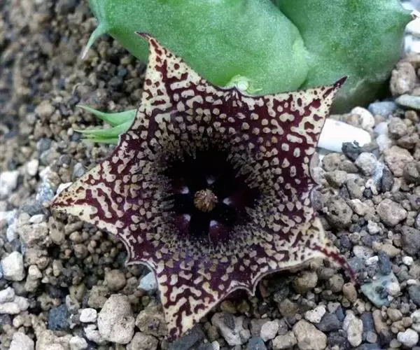 豹皮花株形奇特,五角形的花朵,围绕塔形茎干的基部丛生开放,可作花坛、花园绿化,也可盆栽。