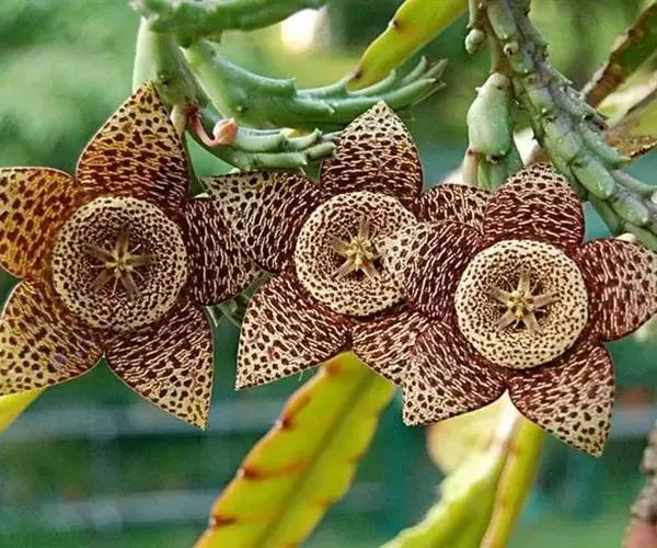 豹皮花像仙人掌,是一种肉质植物,茎呈亮绿色,花单生或数朵簇生;花梗长3-4厘米;花冠五角星状,直径4-6厘米,外面绿色,光滑,内面黄绿色,具暗紫色横条纹及斑点,裂片5,三角状卵形,顶端短尖,边有睫毛。