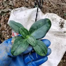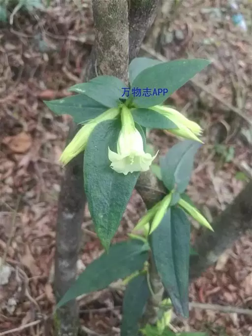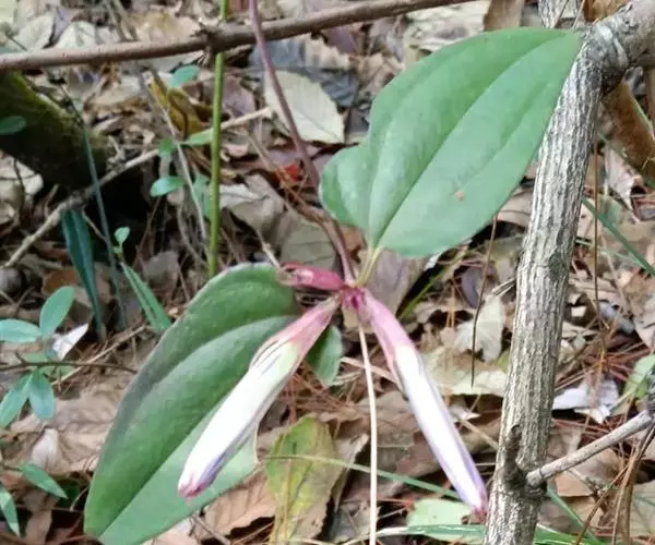 多年生缠绕草本。具短根茎,根黄褐色或深褐色,细圆柱形。茎绿色或紫红色,近圆形具细条棱,上部螺旋扭转,节间长7-17厘米。基生叶通常2对,着生于茎基部,紧贴地面,密集呈双蝴蝶状,卵形、倒卵形或椭圆形,长3-12厘米,宽(1)2-6厘米,先端急尖或呈圆形,基部圆形,近无柄或具极短的叶柄,全缘,上面绿色,有白色或黄绿色斑纹或否,下面淡绿色或紫红色;茎生叶通常卵状披针形,少为卵形,向上部变小呈披针形,长5-12厘米,宽2-5厘米,先端渐尖或呈尾状,基部心形或近圆形,叶脉3条,全缘,叶柄扁平,长4-10毫米。具多花,2-4朵呈聚伞花序,少单花、腋生;花梗短,通常不超过1厘米,具1-3对小苞片或否;花萼钟形,萼筒长9-13毫米,具狭翅或无翅,裂片线状披针形,长6-9毫米,通常短于萼筒或等长,弯缺截形;花冠蓝紫色或淡紫色,褶色较淡或呈乳白色,钟形,长3.5-4.5厘米,裂片卵状三角形,长5-7毫米,宽4-5毫米,褶半圆形,长1-2毫米,比裂片短约5毫米,宽约3毫米,先端浅波状;雄蕊着生于冠筒下部,不整齐,花丝线形,长1.3-1.9厘米,花药卵形,长约1.5毫米;子房长椭圆形,两端渐狭,长1.3-1.7厘米,柄长8-12毫米,柄基部具长约1.5毫米的环状花盘,花柱线形,长8-11毫米,柱头线形,2裂,反卷。蒴果内藏或先端外露,淡褐色,椭圆形,扁平,长2-2.5厘米,宽0.7-0.8厘米,柄长1-1.5厘米,花柱宿存;种子淡褐色,近圆形,长宽约相等,直径约2毫米,具盘状双翅。花果期10-12月。