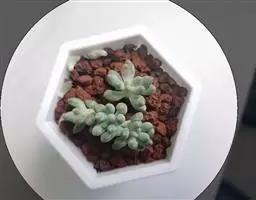 荒玉为番杏科生石花属,原产南非。株体呈白粉色,表面布满凹凸纹路,凹陷处为红褐色,每年秋季开黄花。