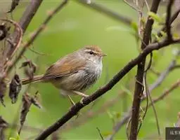 斑胸短翅莺:小型鸟类,体长11-13厘米。上体暗赭褐色,眉纹灰白;下体白色,下喉至上胸具灰褐点斑,…