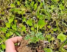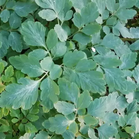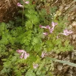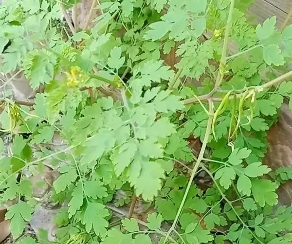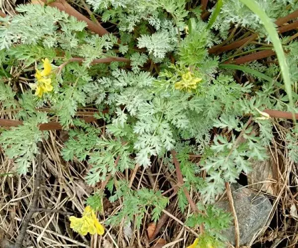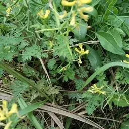黄堇 灰绿色丛生草本,高20-60厘米,具主根,少数侧根发达,呈须根状。茎1至多条,发自基生叶腋,具棱,常上部分枝。基生叶多数,莲座状,花期枯萎。茎生叶稍密集,下部的具柄,上部的近无柄,上面绿色,下面苍白色,二回羽状全裂,一回羽片约4-6对,具短柄至无柄,二回羽片无柄,卵圆形至长圆形,顶生的较大,约长1.5-2厘米,宽1.2-1.5厘米,三深裂,裂片边缘具圆齿状裂片,裂片顶端圆钝,近具短尖,侧生的较小,常具4-5圆齿。