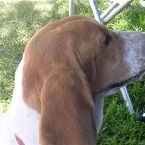 耳:两耳间距小、薄,呈V字形下垂、耳尖钝圆,耳长至咀角处。 鼻:宽阔,鼻镜黑色,白色犬允许肉色。