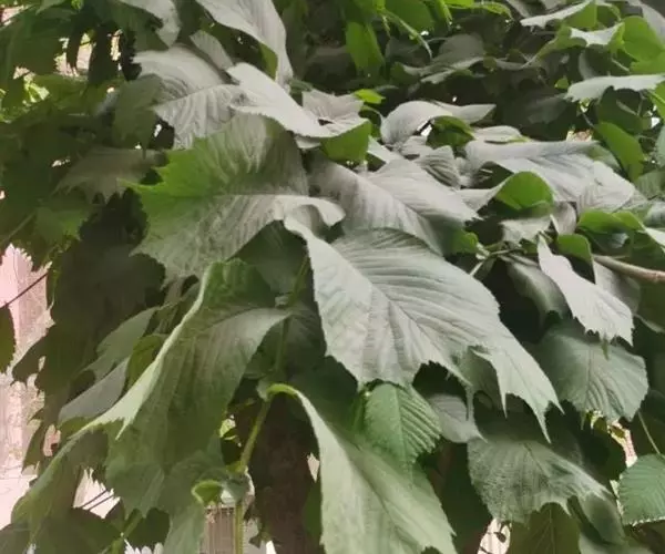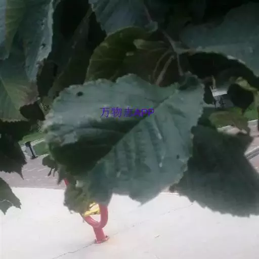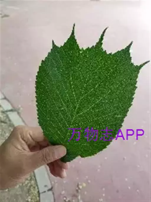 叶倒卵形、倒三角状、倒三角状椭圆形或倒卵状长圆形,长7-18厘米,宽4-14厘米,先端通常3-7裂,裂片三角形,渐尖或尾状,不裂之叶先端具或长或短的尾状尖头,基部明显地偏斜,楔形、微圆、半心脏形或耳状,较长的一边常覆盖叶柄,与柄近等长,其下端常接触枝条,边缘具较深的重锯齿,叶面密生硬毛,粗糙,叶背被柔毛,沿叶脉较密,脉腋常有簇生毛,侧脉每边10-17条,叶柄极短,长2-5毫米,密被短毛或下面的毛较少。