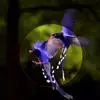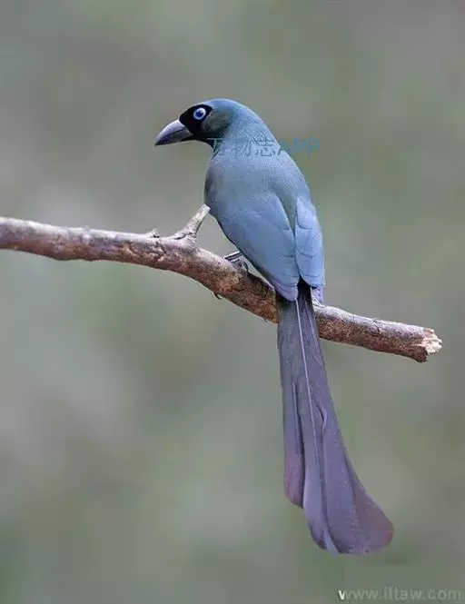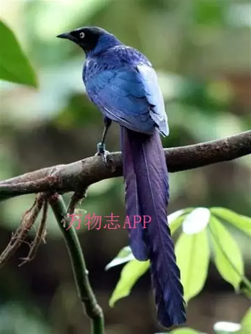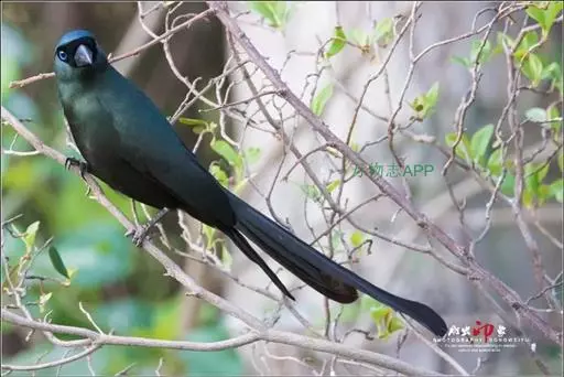 盘尾树鹊(图2) 盘尾树鹊体形中等,身长约35厘米,包括尾长18厘米。是近黑色树鹊。尾甚长而端部展开,通体体羽有金属光泽,具闪亮深灰色,并具铜绿色光泽,嘴粗厚而呈钩状,眼显著蓝色。虹膜-蓝色,嘴-黑色,脚-黑色。 两性相同。第一次换毛的幼鸟羽色更沉闷,偏暗灰,尾巴细长而窄,没有抹刀形式的盘尾。该喙是黑色,嘴尖橙色,眼环橙色,边界淡蓝色。第一年的亚成鸟也有别于成鸟而更加暗灰,尾部保留原来的形状,嘴黄色而不是橙色。在第二次换羽后,会获得成鸟的羽毛,直到2岁才完全与父母相同。