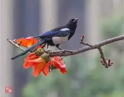 喜鹊:是鸦科、鹊属的一种鸟类。共有11个亚种。体长40-50厘米,雌雄羽色相似,…