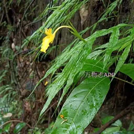 细弱、丛生草本,茎高15-30厘米,径约3毫米。叶5-9片,叶片披针形,长5-14厘米,宽1-2厘米,顶端长尾状渐尖,基部急尖,质薄,无毛,最下部的一片叶较上部的显著地小,无柄或具极短的柄;叶舌圆形,膜质,长不及2毫米。花序顶生,苞片2-3枚,披针形,长3-5厘米,顶端尾状渐尖,内有花1-2朵;花萼管状,长1-1.5厘米;花冠黄色,管长约3厘米,花冠裂片披针形,长约1厘米;侧生退化雄蕊椭圆形,长约1.2厘米;唇瓣黄色,宽卵形,长约1.5-2厘米;花丝短,花药长3毫米;药隔附属体长圆形,长约4毫米。果卵状长圆形,长约1厘米,顶端有宿萼。花期