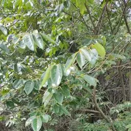 叶革质或厚革质,长圆形、长椭圆形、长圆状披针形,长5-14厘米,宽2-6厘米,先端急尖或渐尖,基部稍呈心形,很少圆形,上面有光泽,深绿色,下面淡绿色,干时上面常灰褐色,下面常红棕色,中脉上面略凹下,下面明显凸起,侧脉每边7-10条,下面突起,小脉结成疏网状,在嫩叶上的不明显;叶柄短,长约2-4毫米。
