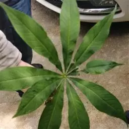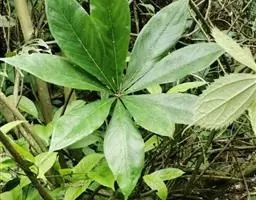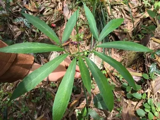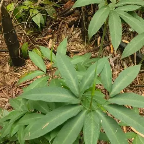 叶常单1,叶柄圆柱形,粉绿色,长30-50厘米,下部3/4鞘筒状,鞘端斜截形;叶片鸟足状分裂,裂片13-19,有时更少或更多,倒披针形、长圆形、线状长圆形,基部楔形,先端骤狭渐尖,全缘,暗绿色,背面淡绿色,中裂片无柄或具长15毫米的短柄,长3-15厘米,宽0.7-5.8厘米,比侧裂片几短1/2;侧裂片长7.7-24.2(-31)厘米,宽(0.7-)2-6.5厘米,向外渐小,排列成蝎尾状,间距0.5-1.5,厘米。