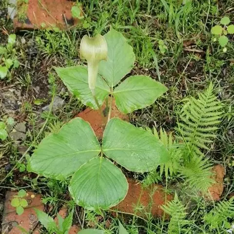 黄苞南星 Schott)是天南星科、天南星属植物,块茎近球形,鳞叶锐尖,叶片鸟足状分裂,…