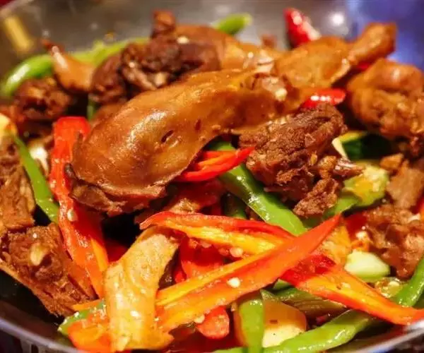 2、炒锅放油,大火烧热后,先将鸭头和鸭腿放入,加老姜和辣椒片稍炒一下,再加入鸭肉块,大火爆炒,直到鸭子外皮成金黄色