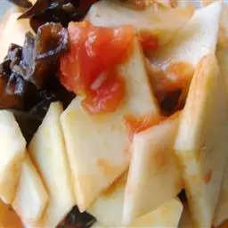 4.盖上锅盖 ,焖到水干,再倒入少许酱油,葱段,鸡精,再翻炒一下,就可起锅了。(爱吃辣椒的,还可在焖时放入一些红辣椒丝);