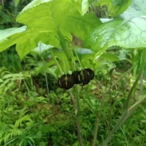 浆果球形或阔椭圆形,暗紫黑色,被白粉。种子红褐色,无假种皮。x=6。