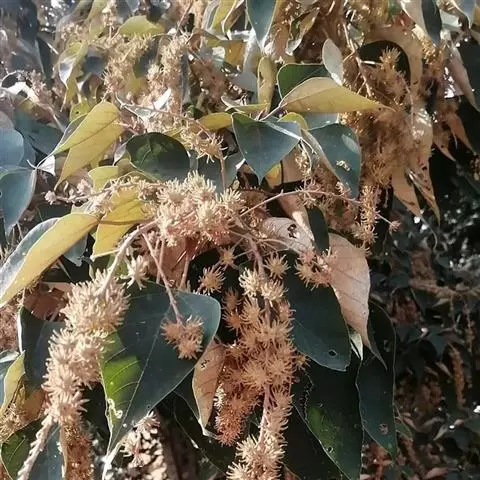 蒴果具2 (-3)个分果爿,直径约1厘米,密生黄色粉末状毛和具颗粒状腺体;种子卵形,直径约5毫米,黑色,有光泽。花期3-5月,果期8-9月。