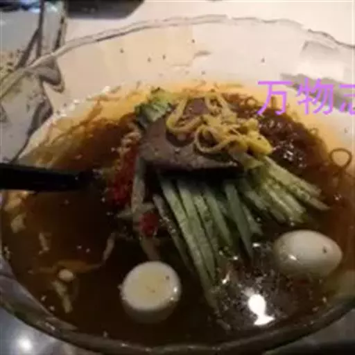 配菜:全瘦牛肉片,苹果/苹果梨或西瓜片,蛋皮丝,咸菜,松子,延边冷面黄瓜丝,熟鸡蛋,熟白芝麻