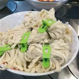 5、将面团放入压面机中边压边漏到滚开开水中,煮至面条发亮晶莹后捞出过冷水冷却。