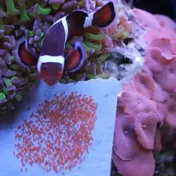 将要产卵的红小丑鱼会用咀仔细地清洗岩石上的藻类和污物等作为将来的产卵床,用尾鳍拂去岩石周围的砂土,认真地进行岩石面的清洁。其后,雌鱼(雌鱼比雄鱼大,体色黑,腹部伸出几毫米长的输卯管)在岩石上磨擦自己的腹部,将卵一粒粒地产下。雄鱼也象雌鱼一样,在卵上磨擦射精,雌雄交替产卵、射精,约1小时产完卵。两次产卵数约1000个左右。产卵后,亲鱼会离去,而用口和胸鳍除去卵上的杂物,扇动水流,继续进行着卵的孵化。这种行为,雄鱼比雌鱼显得更加积极、主动,并随着孵出时日的到来,保护行动与日俱增。