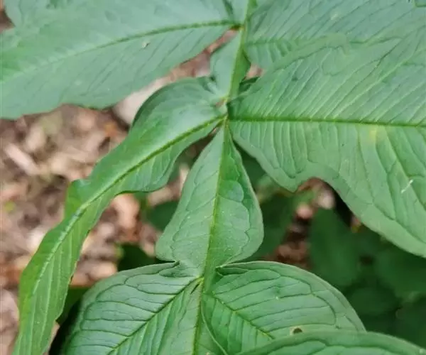 块茎扁球形,直径7.5-25厘米,顶部中央多少下凹,暗红褐色;颈部周围生多数肉质根及纤维状须根。叶柄长45-150厘米,基部粗3-5厘米,黄绿色,光滑,有绿褐色或白色斑块;基部膜质鳞叶2-3,披针形,内面的渐长大,长7.5-20厘米。叶片绿色,3裂,I次裂片具长50厘米的柄,二歧分裂,II次裂片二回羽状分裂或二回二歧分裂,小裂片互生,大小不等,基部的较小,向上渐大,长2-8厘米,长圆状椭圆形,骤狭渐尖,基部宽楔形,外侧下延成翅状;侧脉多数,纤细,平行,近边缘联结为集合脉。