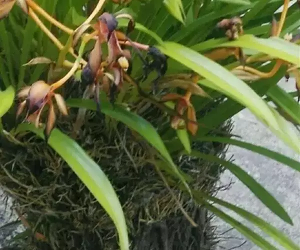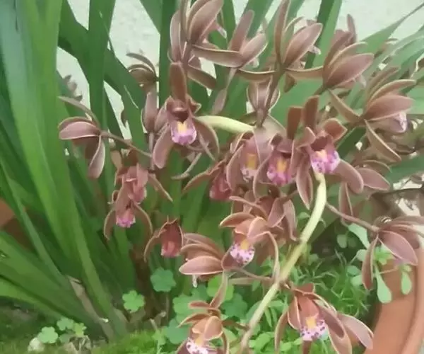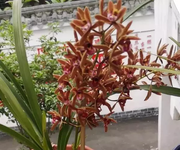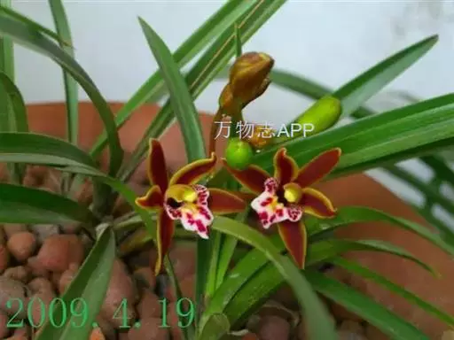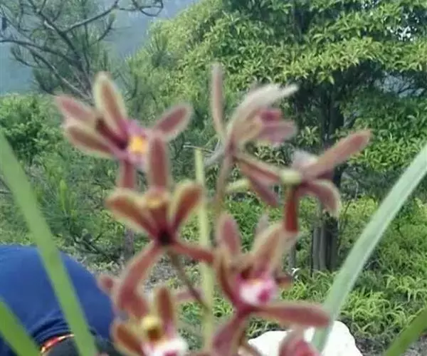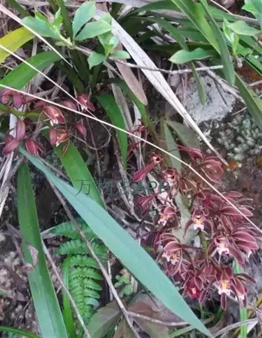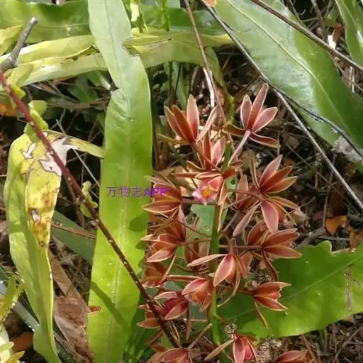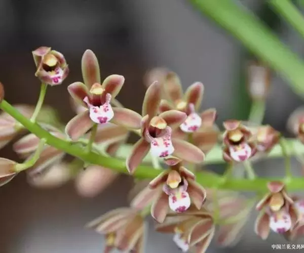 花草发自假鳞茎基部,下垂或外弯,长36~50 cm,近基部具数枚鞘;花序长20~30 cm,具20~40花;花苞片卵状披针形,长4~5 mm;花梗和子房长1.5~2 cm;花浅褐色,直径3~3.5 cm;萼片与花瓣有浅紫色脉和细斑点;唇瓣有浅紫色晕,基部有浅紫色细斑点,在中部两侧有2个深紫色斑块,唇瓣3裂,约等长于花瓣,上面具乳突,侧裂片近半圆形,直立,有紫褐色条纹,边绿紫红色,中裂片近圆形,稍反折,紫红色,中部有浅黄色晕,唇盘从基部至中部具2条平行的褶片,褶片黄色;萼片近相等,萼片狭椭圆形至卵状披针形,长20~22 mm,宽6~7 mm,先端渐尖,红褐色,中部略带黄绿色,边缘稍向后反卷。