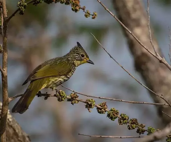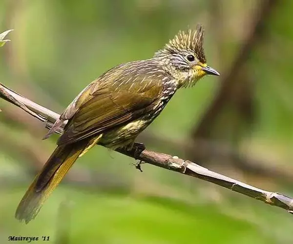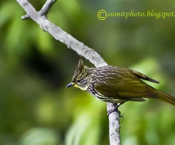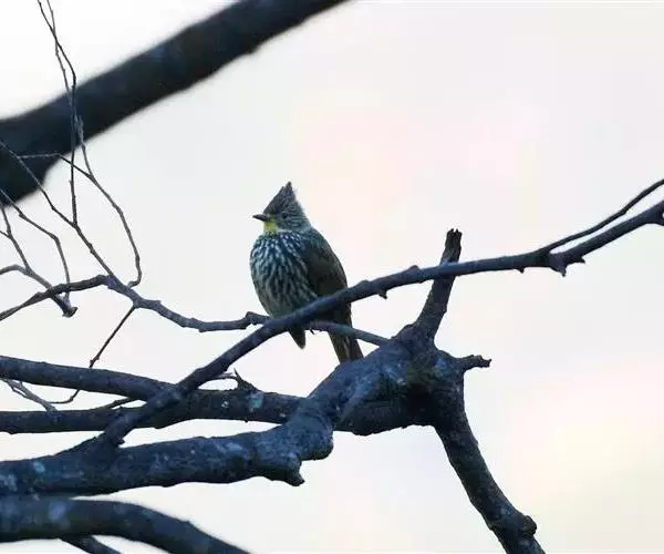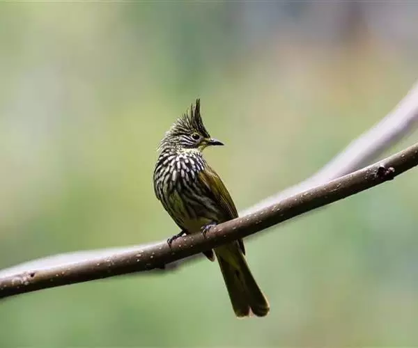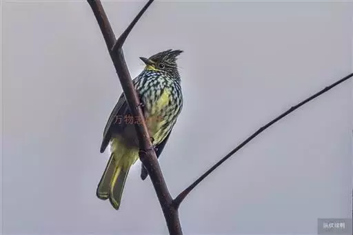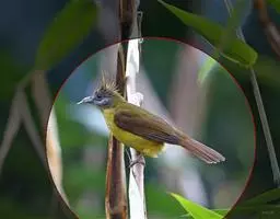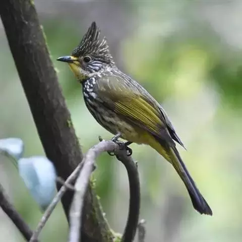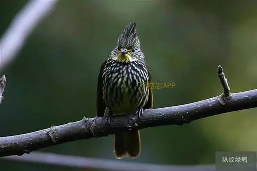 纵纹绿鹎(学名:Pycnonotus striatus):是体型中等大小鸟类,体长20-24厘米。头绿褐色具明显的冠羽,其上具细的白色纵纹。上体橄榄绿色具细的白色纵纹。眼圈浅黄色。喉和尾和覆羽黄色,其余下体暗灰黑色具黄白色纵纹。