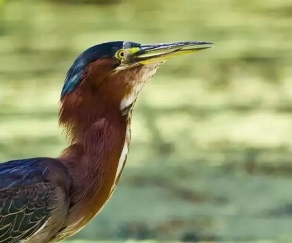 绿鹭是体形较小的涉禽,额、头顶、枕、羽冠和眼下纹绿黑色。羽冠从枕部一直延伸到后枕下部,其中最后一枚羽毛特长。后颈、颈侧及颊纹灰色;额、喉白色。背及两肩披有窄长的青铜绿色的矛状羽,向后直达尾部。所有矛状羽均具有细的灰白色羽干纹。头具黑顶冠,枕冠亦黑色;上体蝉灰绿色;下体两侧银灰色。前额至后枕及冠羽墨绿黑色;眼后有一白斑,颊纹黑色,颚纹白色;后颈、颈侧和体侧烟灰色;背部披灰绿色矛状长羽,羽干纹灰白色;腰至尾上覆羽暗灰;尾黑色具青铜绿色光泽; 初级覆羽、初级飞羽黑褐色,羽端缀黄白色狭缘;次级飞羽、大、中覆羽铜绿色,有金属闪光;颏、喉和胸、腹部中央白色, 斑杂灰色;两胁部灰色;尾下羽灰白色。虹膜金黄色;眼先裸露皮肤黄绿色;嘴缘褐色;脚和趾黄绿色。