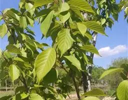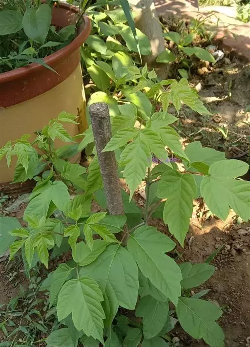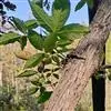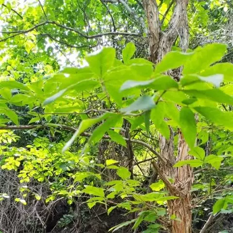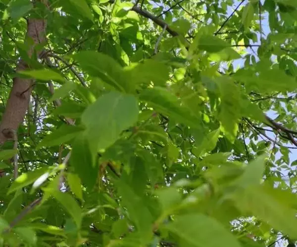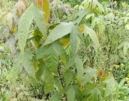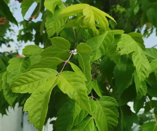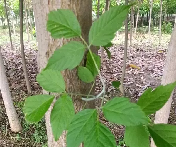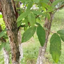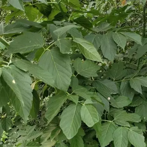 奇数羽状复叶,小叶3-7,叶柄长3-7厘米,生有短绒毛,黄绿色,顶生小叶有柄,长约1.5厘米;小叶片卵形,长5-8 厘米,宽3-4厘米,基部广楔形或钝圆形,先端锐尖,边缘有不整齐的疏锯齿;侧生小叶柄短,长3毫米;小叶片歪卵状披针形,长4-7厘米,宽2.5-3厘米,基里歪楔形或近圆形,先端锐尖,边缘具3-5个粗锯齿,表面绿色,背面黄绿色,脉及边缘生有短绒毛。