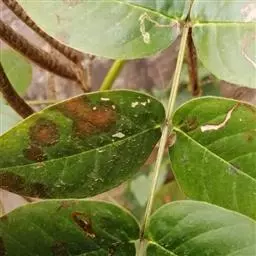 发病时先从下部叶片开始出现症状,后逐步向上部叶片蔓延,发病早期均产生褐色的小点,逐渐发展为圆形或不规则形病斑。褐斑病病斑较大,病斑周围有黄色的晕圈,而黑斑病病斑较小,颜色较褐斑病浅,边缘整齐,没有明显的晕圈。天气潮湿或长期阴雨,病斑可相互联合成不规则形大斑,叶片焦枯,严重影响光合作用。如果发生在叶柄、茎干或果针上,轻则产生椭圆形黑褐色或褐色病斑,重则整个茎干或果针变黑枯死,使花生产量大幅度下降。