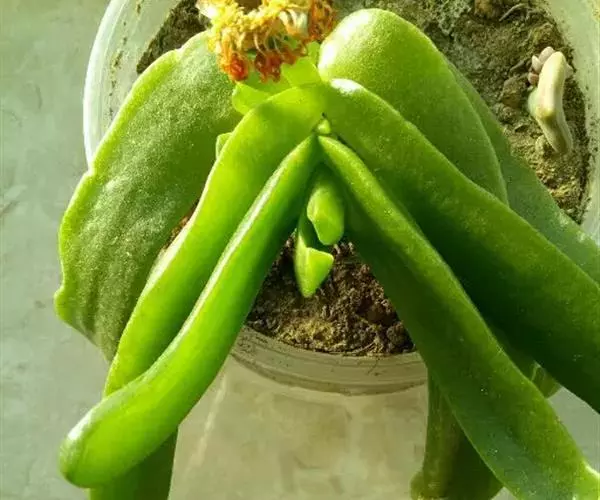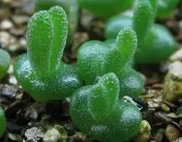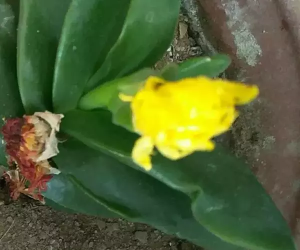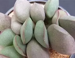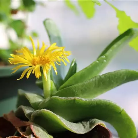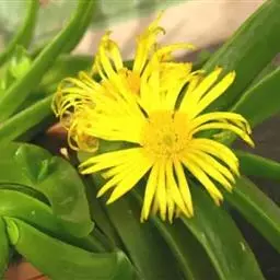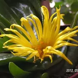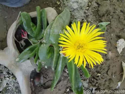 佛手掌,极短,肉质叶舌状,对生2裂,长约10cm,宽2-3,鲜绿色,平滑有光泽。叶端略向外反转,株形像佛手。秋冬季开花,花自叶丛中抽出,花冠金黄色。