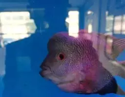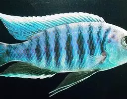 体形/颜色:体长20~25厘米,体呈椭圆形,头大,嘴尖,眼睛位于背鳍的前方并紧靠背部边缘,与其它品种不同。体色蓝绿,体中央有一块大的黑褐色斑块,格外明显,在它的周围有数条彩色条纹向背部和腹部延伸,嘴部有黄色条纹环绕,眼部有一蓝色条纹。