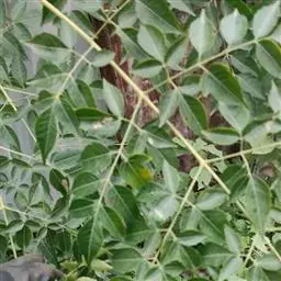 常绿灌木或小乔木,茎多小枝,幼枝顶部具有星状锈色鳞片,后脱落。奇数羽状复叶,互生,叶长5-12(-16)厘米,叶轴和叶柄具狭翅叶轴有窄翅,小叶3—5,对生,厚纸质,长2-7(-11)厘米,宽1-3.5(-5)厘米,倒卵形至长椭圆形,顶端1片最大,下部的远较顶端的为小,先端钝,基部楔形,两面无毛,全缘,叶脉明显,侧脉每边约8条,极纤细,和网脉均于两面微凸起。