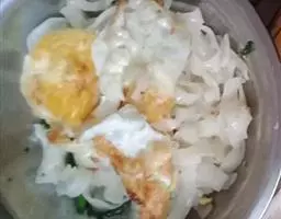 3·咸蛋黄蒸熟(8分钟),用刀背碾碎+糖+牛奶+油混合调匀,成馅儿。