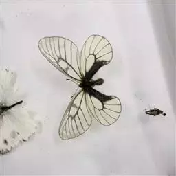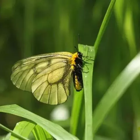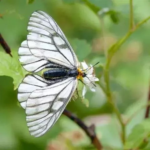 阿波罗绢蝶是一种大型蝶类,以秀丽清雅而倍受人们喜爱。翅展7-8.4厘米。翅白色或淡黄白色。半透明。前翅中室中部及端部有大黑斑,中室外有2枚黑斑,外缘部分黑褐色,亚外缘有不规则的黑褐带,后缘中部有1枚黑斑。后翅基部和内缘基半部黑色;前缘及翅中部各有1枚红斑,有时有白心,周围镶黑边;臀角及内侧有2枚红斑或1红1黑斑,其周围镶黑边;亚缘黑带断裂为6个黑斑。翅反面与正面相似,但翅基部有4枚镶黑边的红斑,2枚臀斑也为具黑边的红斑。雌蝶色深,前翅外缘半透明带及亚缘黑带较雄蝶宽而明显,后翅红斑较雄蝶大而鲜艳。