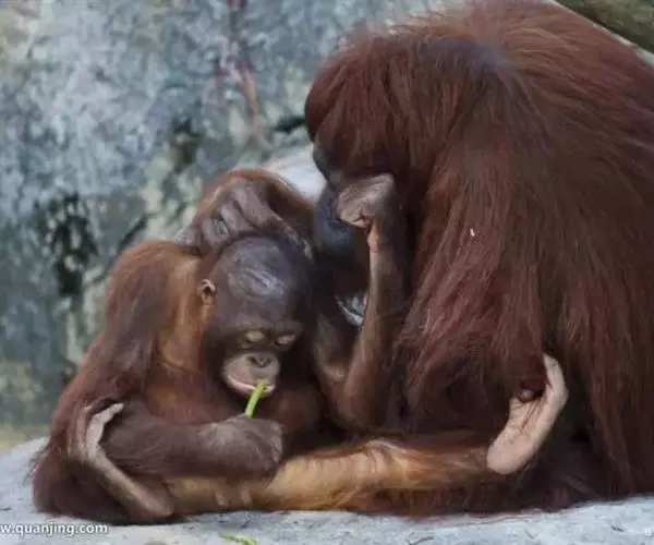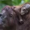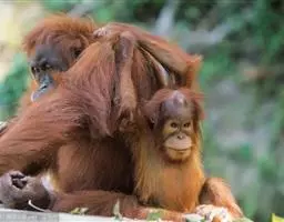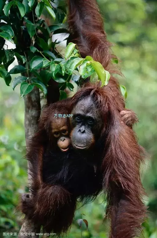 猩猩母子 亚洲猩猩一度广泛分布在东南亚和中南半岛,现仅存于婆罗洲和苏门答腊岛北部的热带山地森林、低地龙脑香森林、热带泥炭沼森林和热带卫生保健林中。现发现湿地森林生境生活着高密度的红毛猩猩群;苏门答腊岛北部则有大约9000只红毛猩猩存活,它们主要活动在一个国家公园的四周;另有10000~15000只红毛猩猩生活在婆罗洲岛,主要活动在八个隔离区。