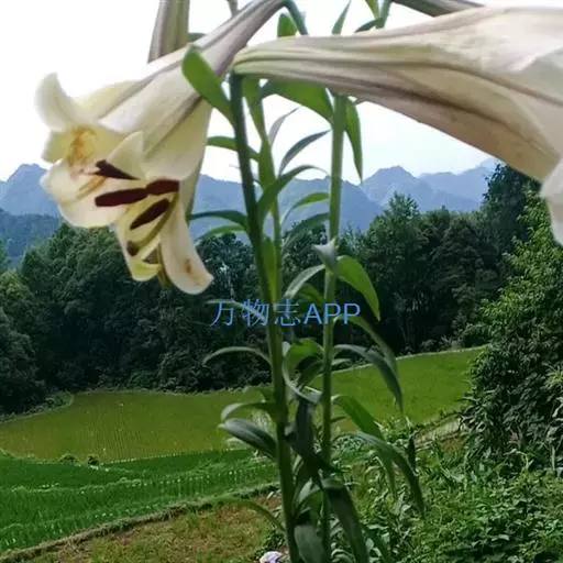 野百合(学名:Lilium brownii F.E.Br. ex Miellez):鳞茎球形,直径2-4.5厘米;鳞片披针形,长1.8-4厘米,宽0.8-1.4厘米,无节,白色。茎高0.7-2米,有的有紫色条纹。叶散生,具5-7脉,全缘,两面无毛。花单生或几朵排成近伞形;花喇叭形,有香气,乳白色,外面稍带紫色,无斑点,向外张开或先端外弯而不卷。蒴果矩圆形,有棱,具多数种子。花期5-6月,果期9-10月。