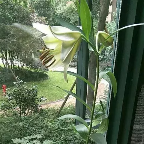 花单生或几朵排成近伞形;花梗长3-10厘米,稍弯;苞片披针形,长3-9厘米,宽0.6-1.8厘米;花喇叭形,有香气,乳白色,外面稍带紫色,无斑点,向外张开或先端外弯而不卷,长13-18厘米;外轮花被片宽2-4.3厘米,先端尖;内轮花被片宽3.4-5厘米,蜜腺两边具小乳头状突起;雄蕊向上弯,花丝长10-13厘米,中部以下密被柔毛,少有具稀疏的毛或无毛;花药长椭圆形,长1.1-1.6厘米;子房圆柱形,长3.2-3.6厘米,宽4毫米,花柱长8.5-11厘米,柱头3裂。