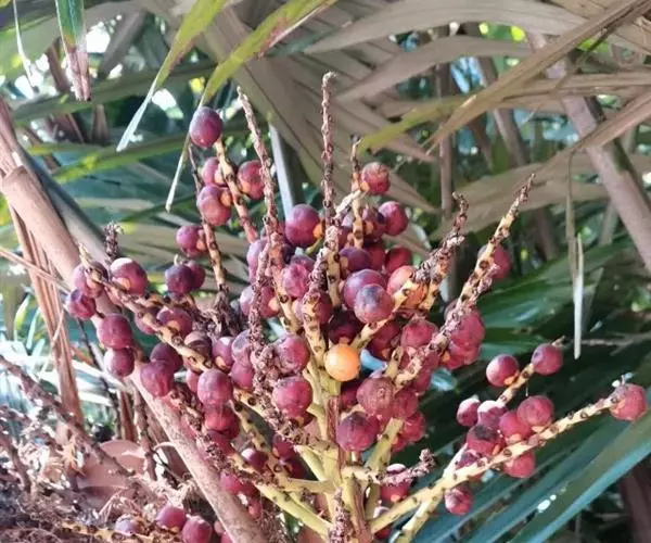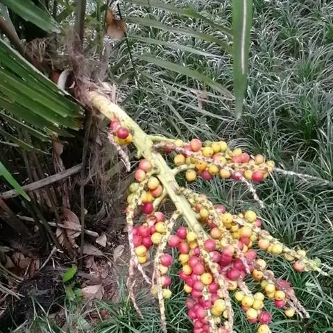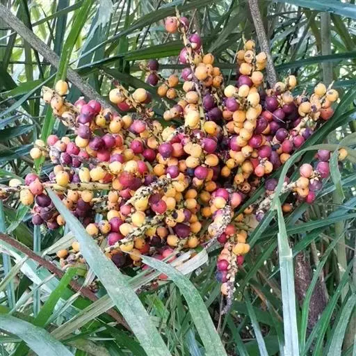 种子采收:鉴定种子是否成熟、能否采收是保证种子发芽的关键。山棕果熟时,果实是紫红色的,剥开果实种子呈黑褐色,胚乳坚硬,表明种子充分成熟,即可采收。