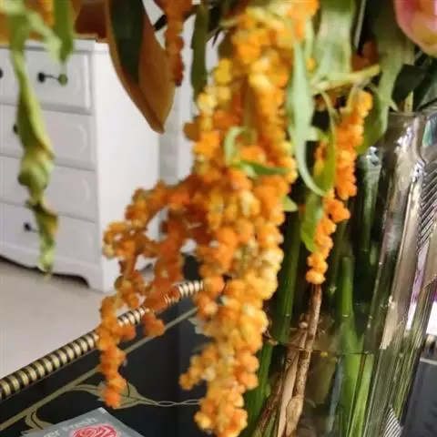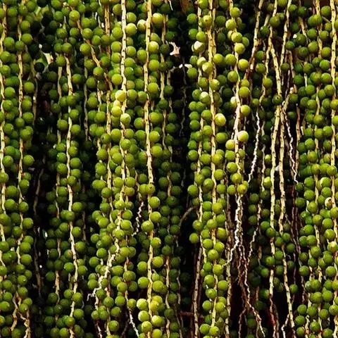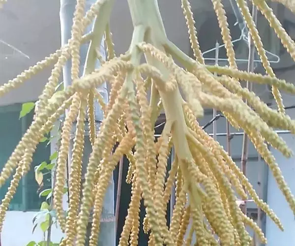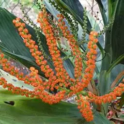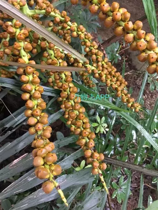 花序生于叶间,长30-50厘米,多分枝,分枝长约30厘米,螺旋状排列于花序轴上;花雌雄同株;雄花稍大,长约1.5厘米,黄色,有香气,萼片3,覆瓦状排列成杯状,花瓣3,长椭圆形,长1.5厘米,雄蕊约40枚,不具芒尖;雌花近球形,花萼近圆形,花瓣三角形,长约6毫米,宽5毫米。果实近球形,钝三棱,充分成熟时为红色,直径约1.8厘米,高1.7厘米。种子3颗,通常有1种子发育不全,黑褐色,钝三棱状,长1厘米,宽0.8厘米,厚0.6厘米,胚乳均匀,胚背生。花期5-6月,果期11-12月。