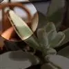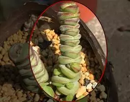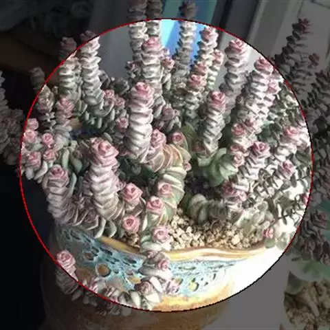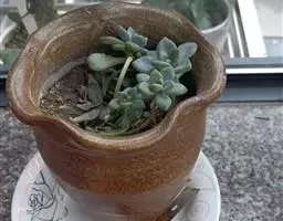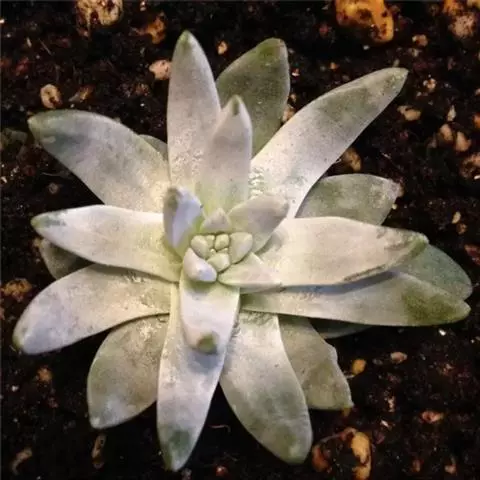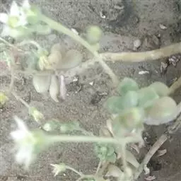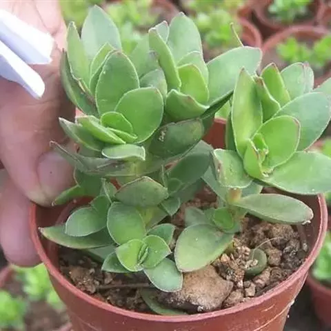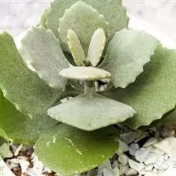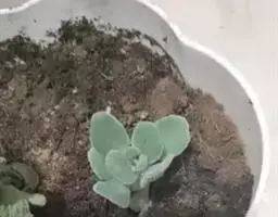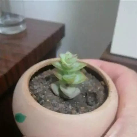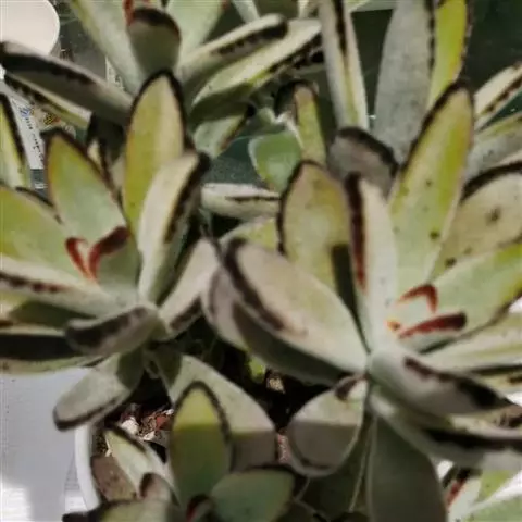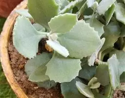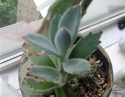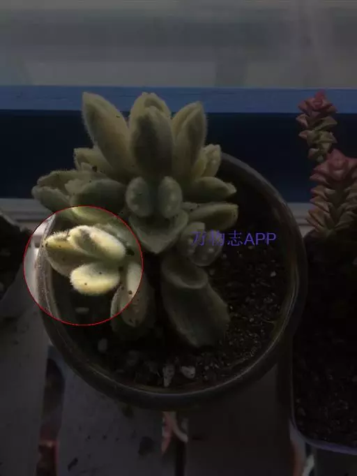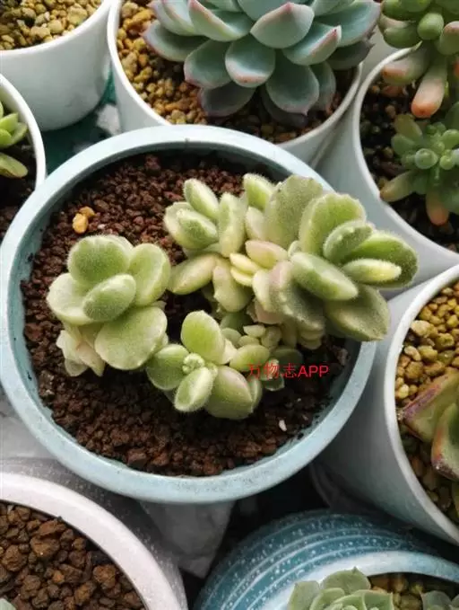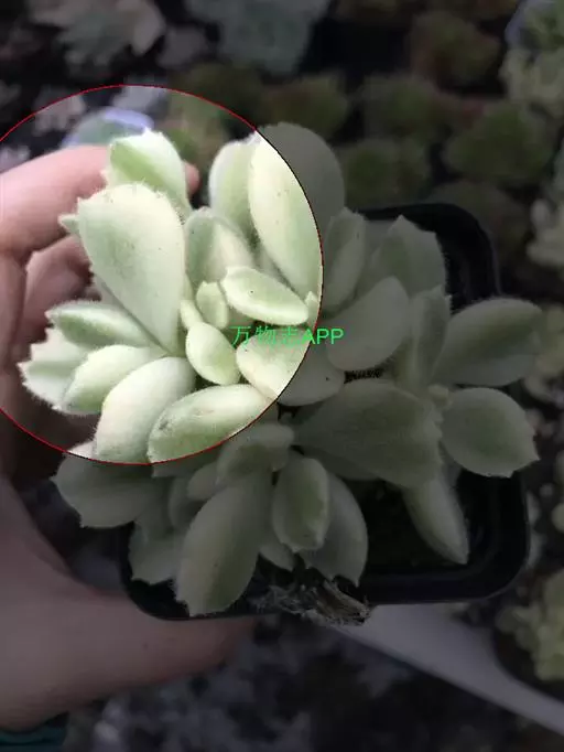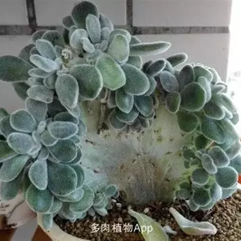植株呈多分枝的矮小灌木状,老茎深褐色,幼枝灰色,肥厚多肉的叶片交互对生,叶卵形,长2~3厘米,宽1~1.5厘米,顶部的叶缘具缺刻。叶片表面密生白色的细短绒毛,叶尖有几个小爪强光下会变红。