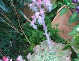 熊童子白锦(学名:Cotyledon ladismithiensis var iegata),是景天科银波木属多年生肉质草本植物,熊童子白锦总状花序,花为微红色,原产非洲的纳米比亚。