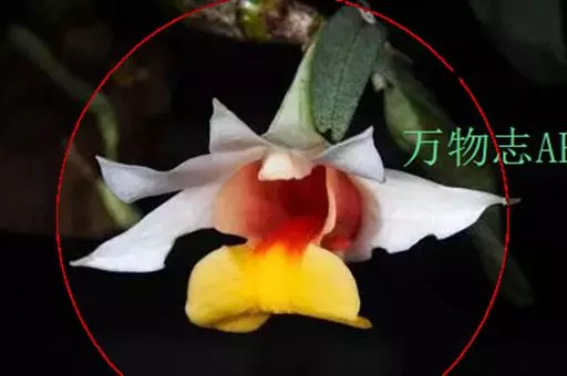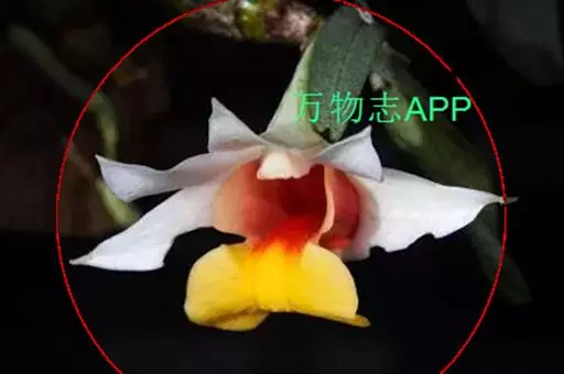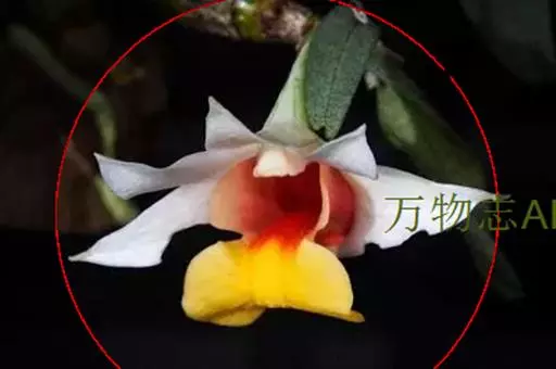 总状花序顶生或近茎的顶端发出,花序轴长5-7毫米,具1-3朵花;花序柄长2-3毫米;花苞片膜质,卵状披针形,长7-10毫米;花梗和子房长约2.5厘米;花开展,除唇瓣的中裂片金黄色和侧裂片的内面橘红色外,均为白色;中萼片卵状披针形,长约2.5厘米,宽约1厘米,先端急尖,具7条脉;侧萼片斜卵状披针形,长2.5厘米,宽1厘米,先端急尖,具7-8条脉;萼囊宽圆锥形,长约1厘米。