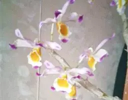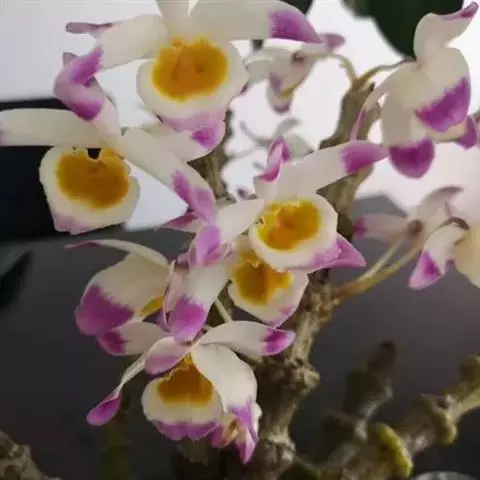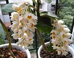 矮石斛(学名:Dendrobium bellatulum Rolfe):茎直立或斜立,粗短,纺锤形或短棒状,具许多波状纵条棱和2-5节。叶2-4枚,近顶生,革质,舌形,卵状披针形或长圆形。总状花序顶生或近茎的顶端发出,具1-3朵花;花开展,除唇瓣的中裂片金黄色和侧裂片的内面橘红色外,均为白色;花瓣倒卵形,等长于中萼片而较宽,先端近圆形,具5条脉;唇瓣近提琴形,长约3厘米,3裂。花期4-6月。