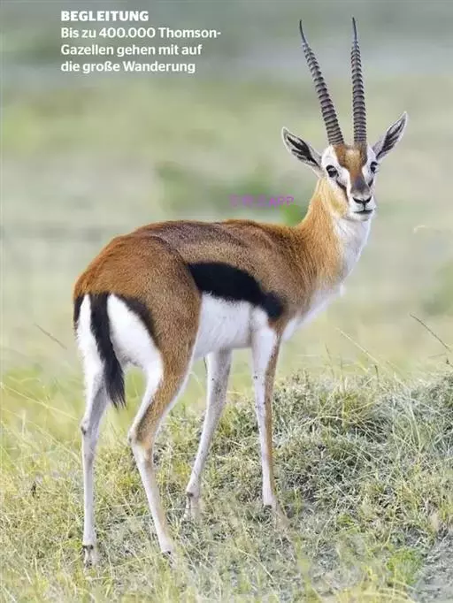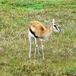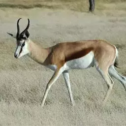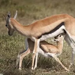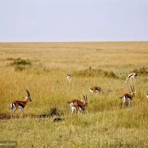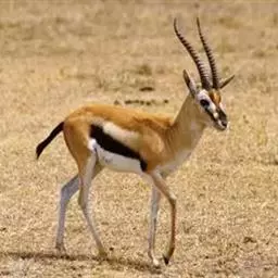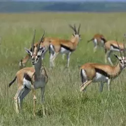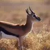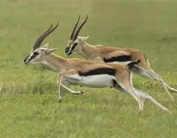 汤普逊瞪羚是诸多瞪羚中最出名的一种,它和我国的藏羚羊 瞪羚 、蒙古黄羊同属一类。它们身材娇小,体态优美,是草原食肉动物渴望的美餐。汤普逊瞪羚对付强敌的办法就是“逃跑”。非洲草原上,它的速度仅次于猎豹。而且它的纵身一跳可高达3m,跨度9m。雄性瞪羚是好斗的,尤其表现在争夺伴侣和领土上,他们通过对抗或者彼此用角的顶撞来决定谁是胜利者,战败者将会离开此地去寻找新的领地。小瞪羚出生五分钟后,就能跟着母亲跑动了,六周左右,小瞪羚就已经是短跑健将了。这是他们天生的本领,因为周围的猛兽太多了,不如此就难以存活,小瞪羚还有一种保护自己的方法,就是保持低调,躲在草丛中,这个方法十分管用,就连强大的猎豹,也无法发现它,再加上小瞪羚还未发育成熟,身上也没有过重的气味,瞪羚母亲还经常舔小瞪羚,让它身上仅有的一点气味也消失不见,让它更不容易被发现。汤普逊瞪羚胆小而敏捷,一旦发现危险,就会撒开长腿急速奔跑,速度可达每小时90km。羚羊的寿命较短,一般不超过20岁。瞪羚虽然也是个奔跑健将,但它比不上自己的仇敌猎豹。两个同样善跑的动物为了各自的生存,常常展开“追逐战”。但往往猎豹在汤普逊瞪羚的几次突然转向后,只能望“羊”兴叹了。瞪羚能飞快的逃离捕食者。当危险临近时,它们四条腿直直的向下伸,身体腾空高高跃起。这种被称为腾跃的动作,用来警告其他瞪羚有危险,同时也能起到迷惑敌人的作用。