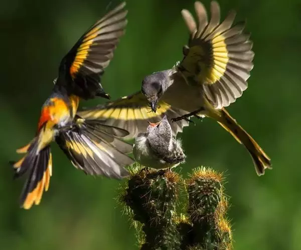 雀形目山椒鸟科山椒鸟属(Pericrocotus)10种亚洲鸟的统称。多数种类的雄鸟黑红相间,雌鸟淡黄与灰色相间。栖居于从阿富汗到日本、菲律宾和马来西亚的森林中。成小群,不断发出洪亮圆润的叫声,在树梢觅食昆虫。赤红山椒鸟是常见的广布种,长23公分(9吋)。