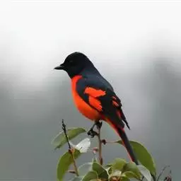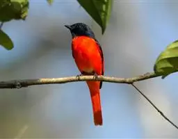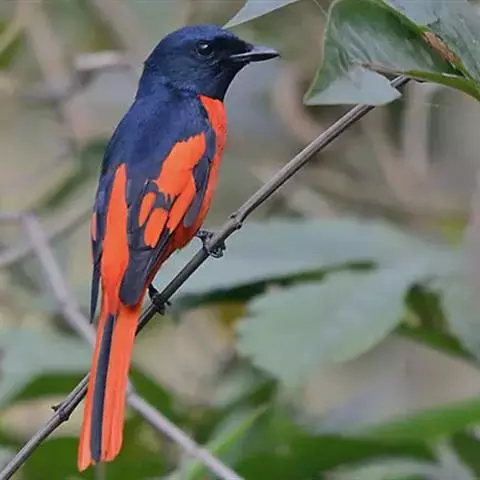 长尾山椒鸟 山椒鸟头顶至上背亮黑色,腰、尾上覆羽和下体猩红色,中央尾羽黑色,外侧尾羽具显著的红色。翅羽黑色,但有宽阔的红色翼斑,内侧数枚飞羽先端有椭圆形红斑,翼侧形成一例红点,非常美丽。嘴黑色,眼睛赤黑眶绿色,足黑色。雌乌的颜色却是黄色,而不是红色。