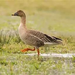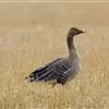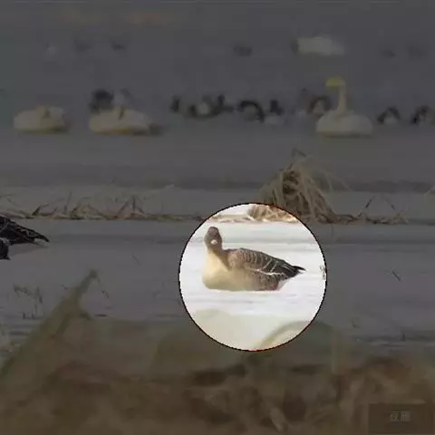 豆雁,雁形目鸭科。成鸟头、颈、背灰褐色,带淡黄色羽缘;尾上覆羽白色,尾羽黑褐色带白端,…