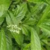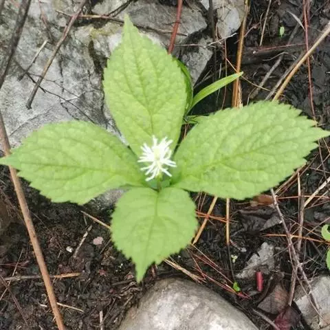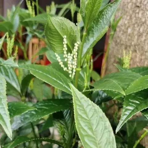 叶对生,通常4片生于茎上部,纸质,宽椭圆形、卵状椭圆形或倒卵形,长9-18厘米,宽5-9厘米,顶端渐尖,基部楔形至宽楔形,边缘具锯齿,齿端有一腺体,背面中脉、侧脉有鳞屑状毛;叶脉6-8对;叶柄长0.5-1.2厘米;鳞状叶卵状三角形,膜质。托叶小,钻形。穗状花序顶生,通常两歧或总状分枝,连总花梗长10-16厘米,总花梗长5-8厘米;苞片通常宽卵状三角形或近半圆形;花白色;雄蕊3枚,基部几分离,仅内侧稍相连,中央药隔长3毫米,有1个2室的花药,两侧药隔稍短,各有1个1室的花药,药室在药隔的基部;子房卵形,无花柱,柱头近头状。核果球形,长约3毫米,具短柄。花期4-6月,果期7-8月 。