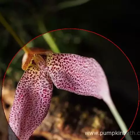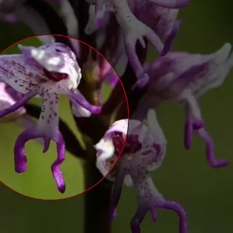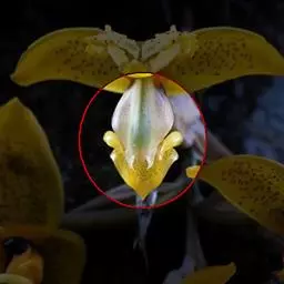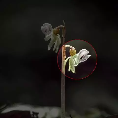 花瓣较小,宽倒卵形,先端钝;唇瓣白色,3裂;侧裂片直立,耳状,长约4毫米,宽2毫米,先端钝并且带紫褐色,边缘稍波状;中裂片肉质,狭长圆形,两侧压扁,长约4毫米,宽1毫米,先端钝,中央具2条合生的高脊突;距黄绿色,长3-4毫米,粗约2毫米,中部缢缩而下部扩大成拳卷状,内面在腹壁上方具1枚扁圆形的附属物,背壁(位于蕊柱基部下方)具1枚片状的附属物;蕊柱长约3毫米;蕊喙位于蕊柱基部上方,质地硬而肥厚,马鞍形;药帽前端伸长成长尾状;粘盘柄线形,长约3毫米;粘盘近圆形,比粘盘柄宽。