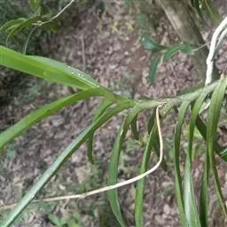 寄树兰茎坚硬,圆柱形,长达1米,粗5毫米,节间长约2厘米,下部节上具发达而分枝的根。叶二列,长圆形,长6-12厘米,宽1.5-2 (-2.5) 厘米,先端近截头状并且啮蚀状缺刻。