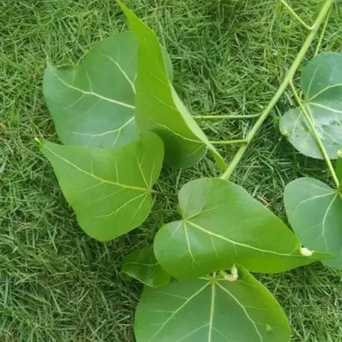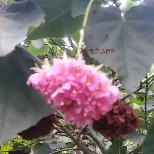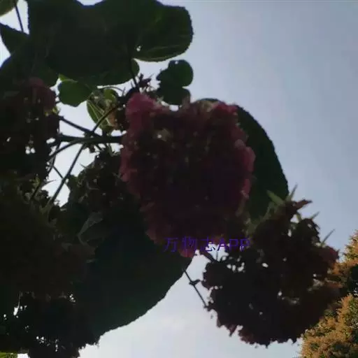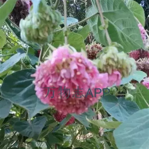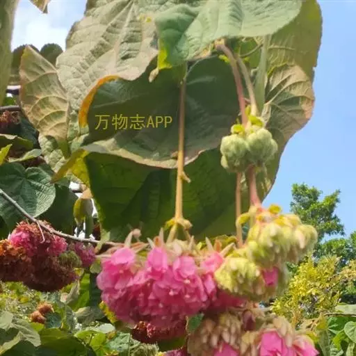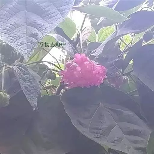 叶面质感粗糙,单叶互生,具托叶,心形,叶缘顿锯齿,掌状脉7至9条,枝及叶均被柔毛。