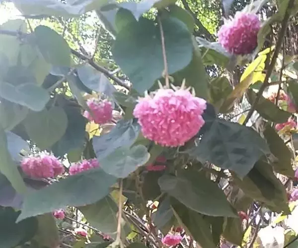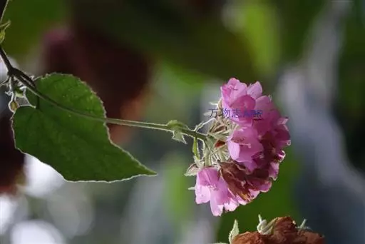 花从叶腋间伸出,悬吊著一个花苞。花为伞形花序,因此开花时会长出花轴,花轴下辐射出具等长小花梗的小花。一个花球可包含二十多朵粉红色的小花,每朵小花有瓣5块,约2.54厘米大,有一白色星顶状雄蕊及多枝雌蕊围绕。全开时聚生且悬吊而下,冬季开花,花期为由12月至翌年3月。